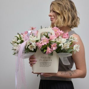 Букет из розовых и белых альстромерий в стильной сумочке